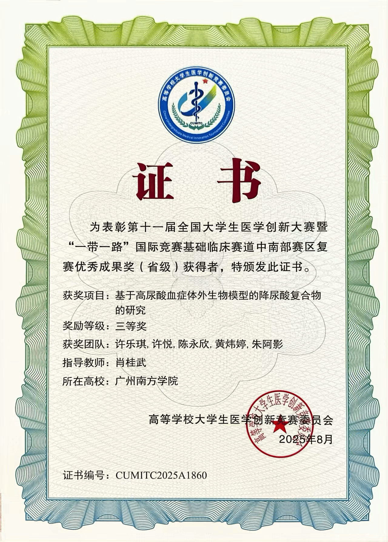 奖项名称:第十一届全国大学生医学创新大赛暨“一带一路”国际竞赛基础临床赛道中南部赛区复赛的参赛论文